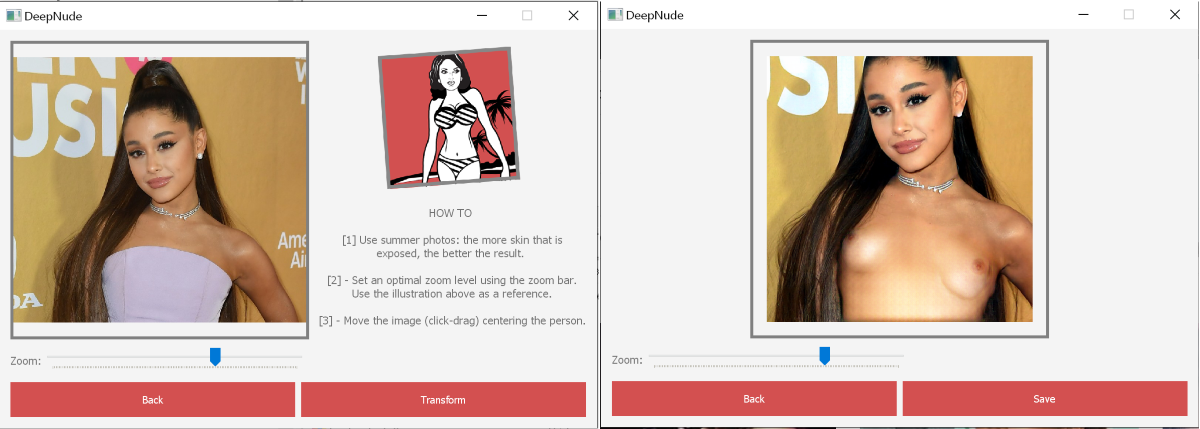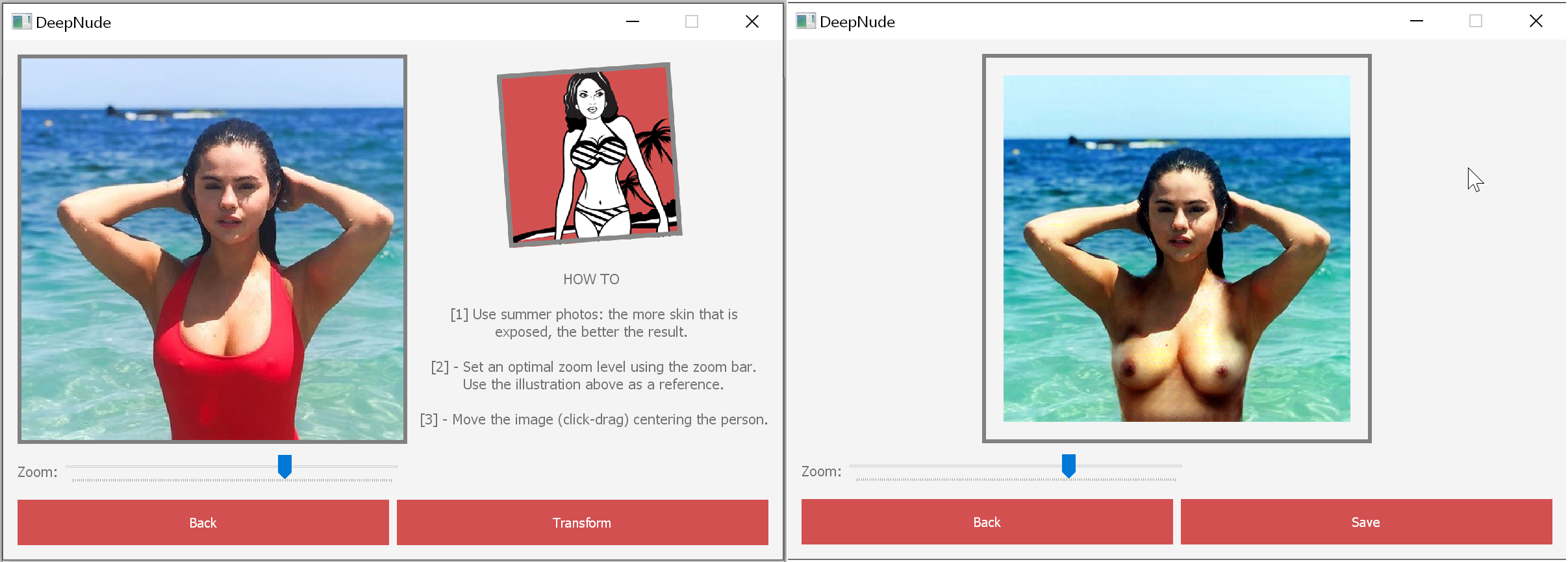 Для активации магии нужно скормить фотографию твоей одноклассницы, коллеги, бывшей, любимой селебы приложению и через несколько секунд, минут, часов (в зависимости от мощностью компьютера) получить обнажённую версию снимка. Ну или с сиськами на лбу, как повезёт.