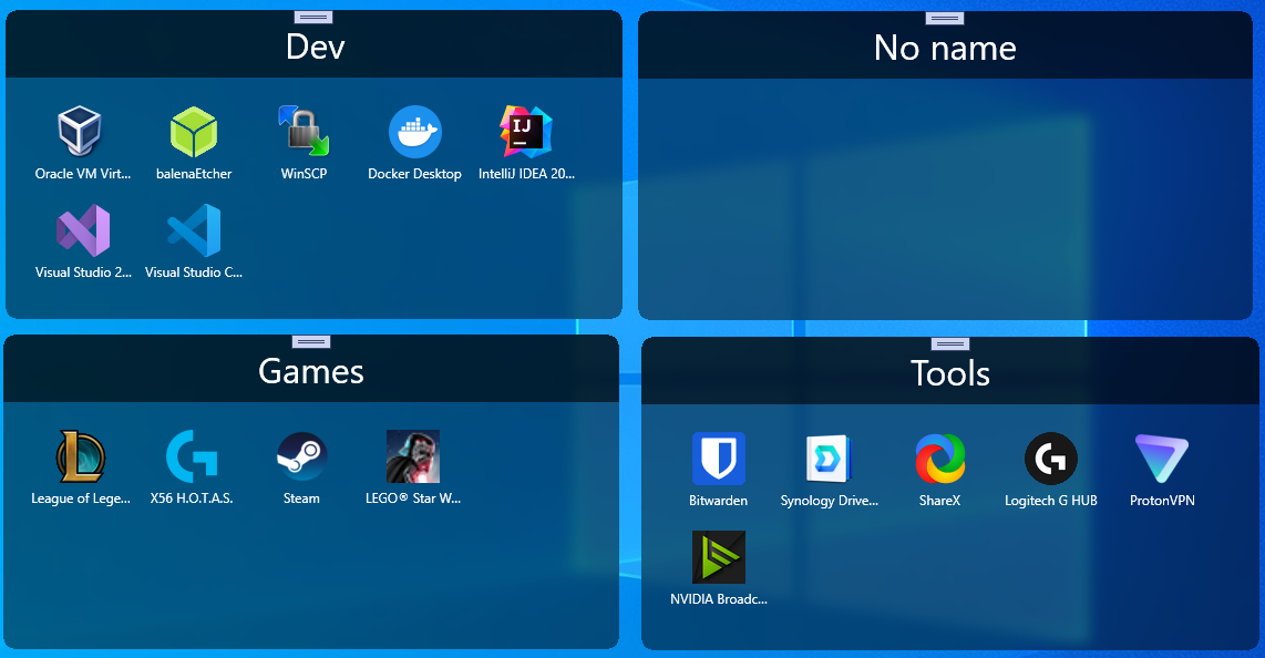 Ещё одна альтернатива с открытым кодом. Минимум настроек и возможностей: просто создаёте зоны с нужным названием и размером. Из явных минусов — не получится в такую зону добавить ярлыки с рабочего стола.