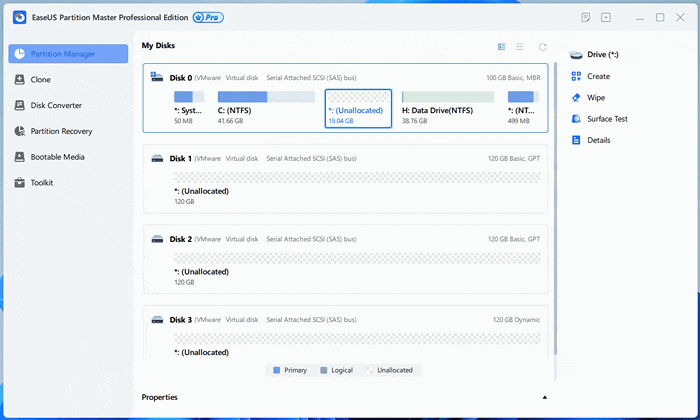 Active@ Partition Manager позволяет создавать новые разделы из нераспределённого дискового пространства, а также управлять существующими разделами, например изменять их размер и форматирование. А понятные помощники значительно облегчают выполнение этих задач.