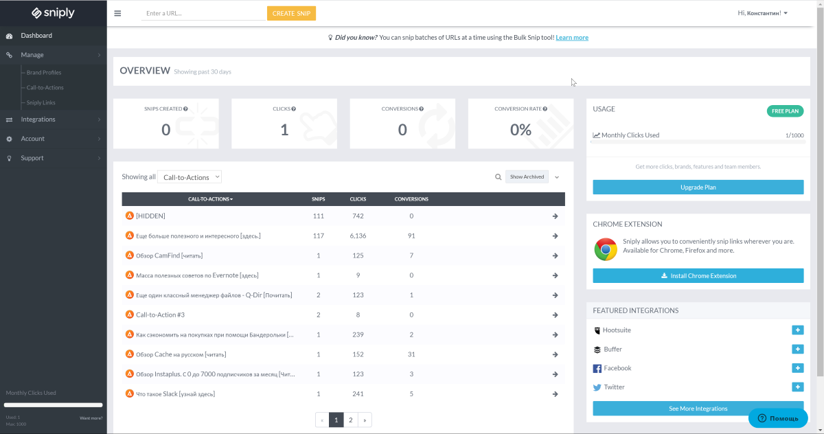 Этот сервис помогает добавить к каждой ссылке CTA. Таким образом, вы можете продвигать свой контент при переходе по ссылкам сервиса. Дополнительно Sniply отслеживает отдельно статистику ссылки и CTA.