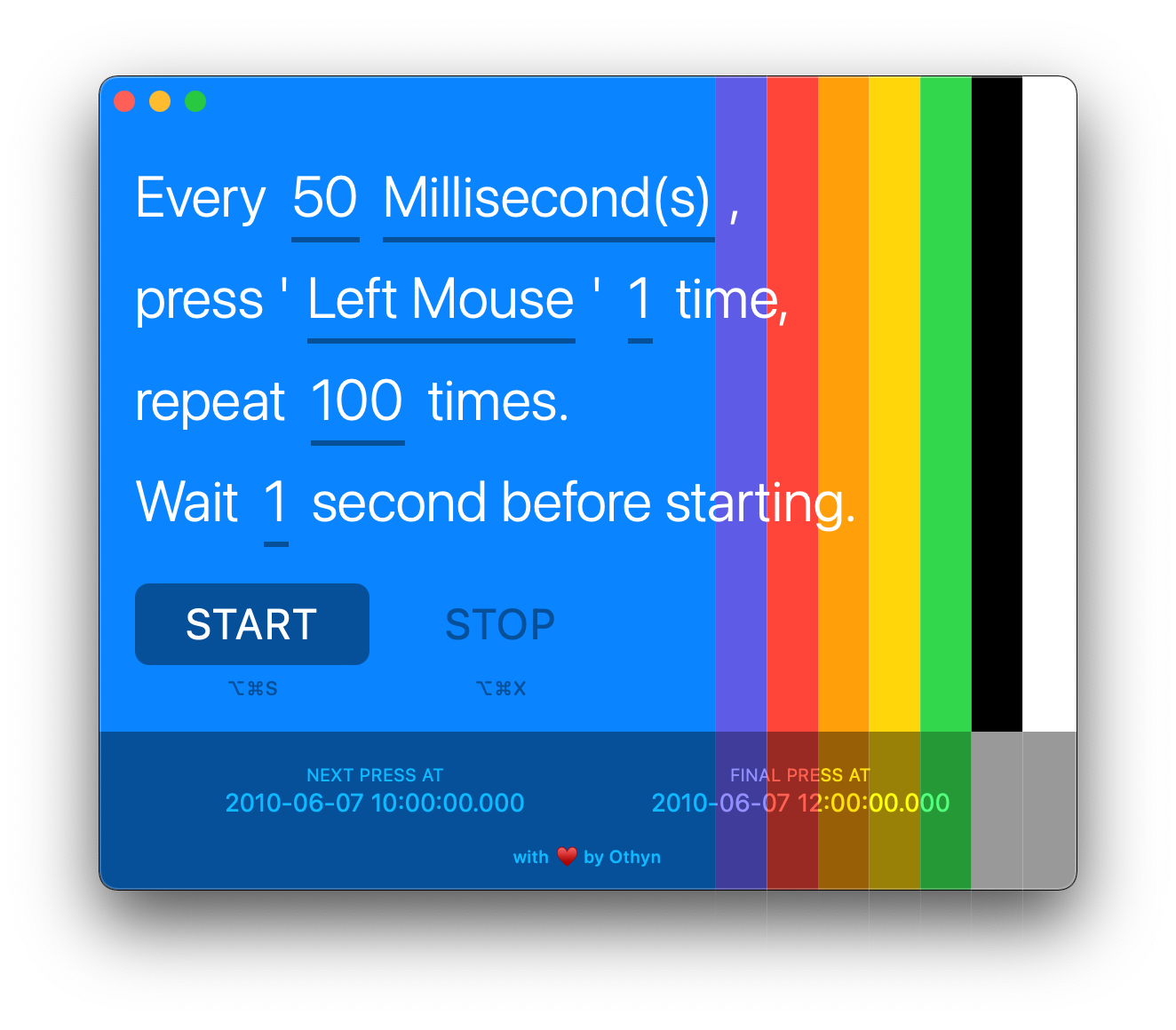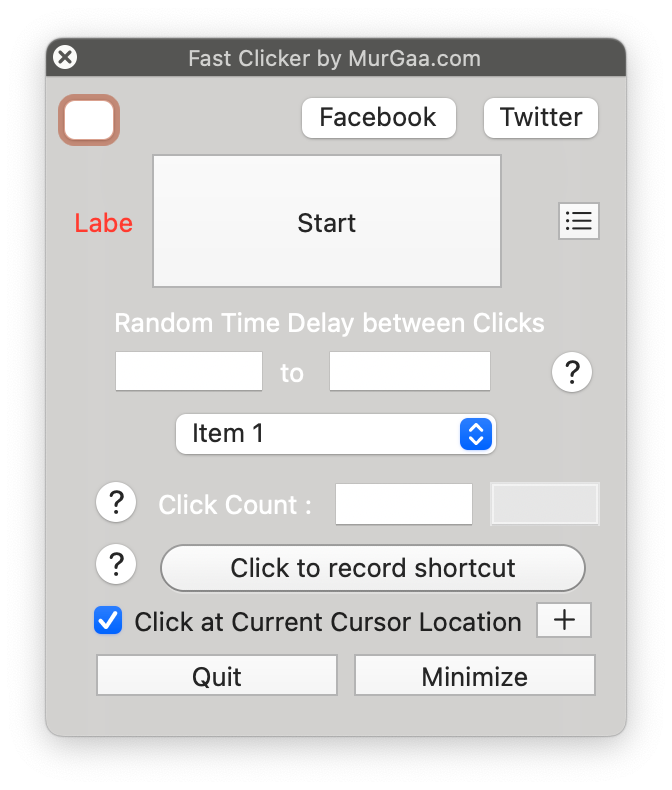Очень простой кликер. Вы указываете скорость нажатий любой кнопки мыши или клавиатуры, их количество и паузу. При нажатии на Start начинается беспощадное закликивание.