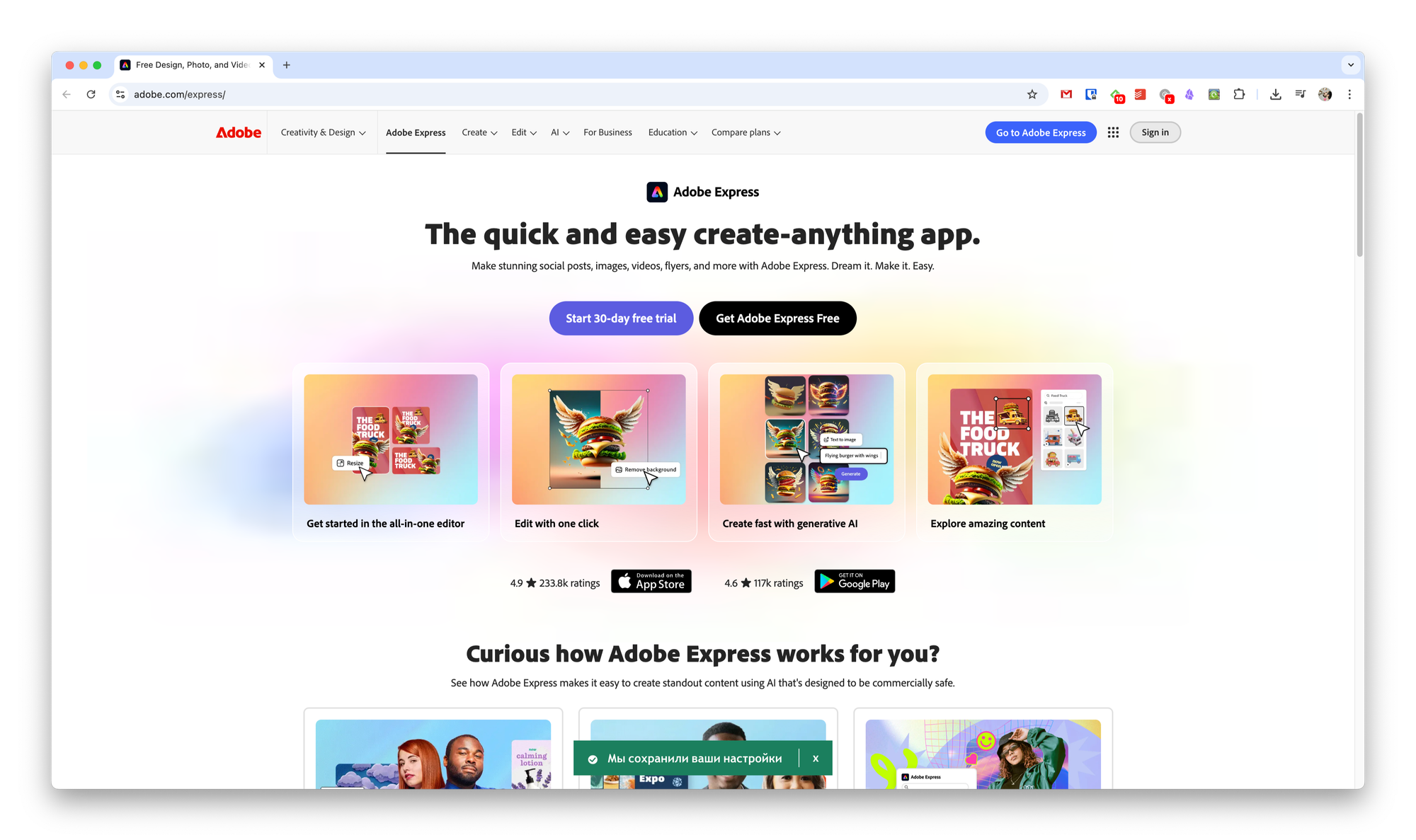 Вы можете использовать готовые шаблоны, стоковые изображения, различные значки и эффекты. Также прога тесно дружит (что логично) с другими продуктами Adobe.
