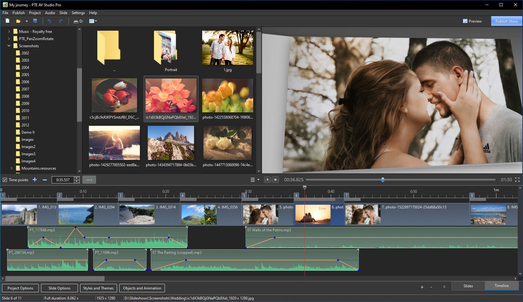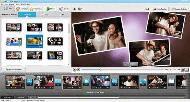 Ещё одна прога для генерации слайд-шоу на компьютерах с Windows. Здесь вы сможете добавлять к своим слайд-шоу красивое музыкальное оформление, потрясающие 2D- и 3D-переходы. Затем готовой работой можно прямо из программы поделиться с кем угодно или опубликовать её на популярных площадках (YouTube, Facebook и пр.).