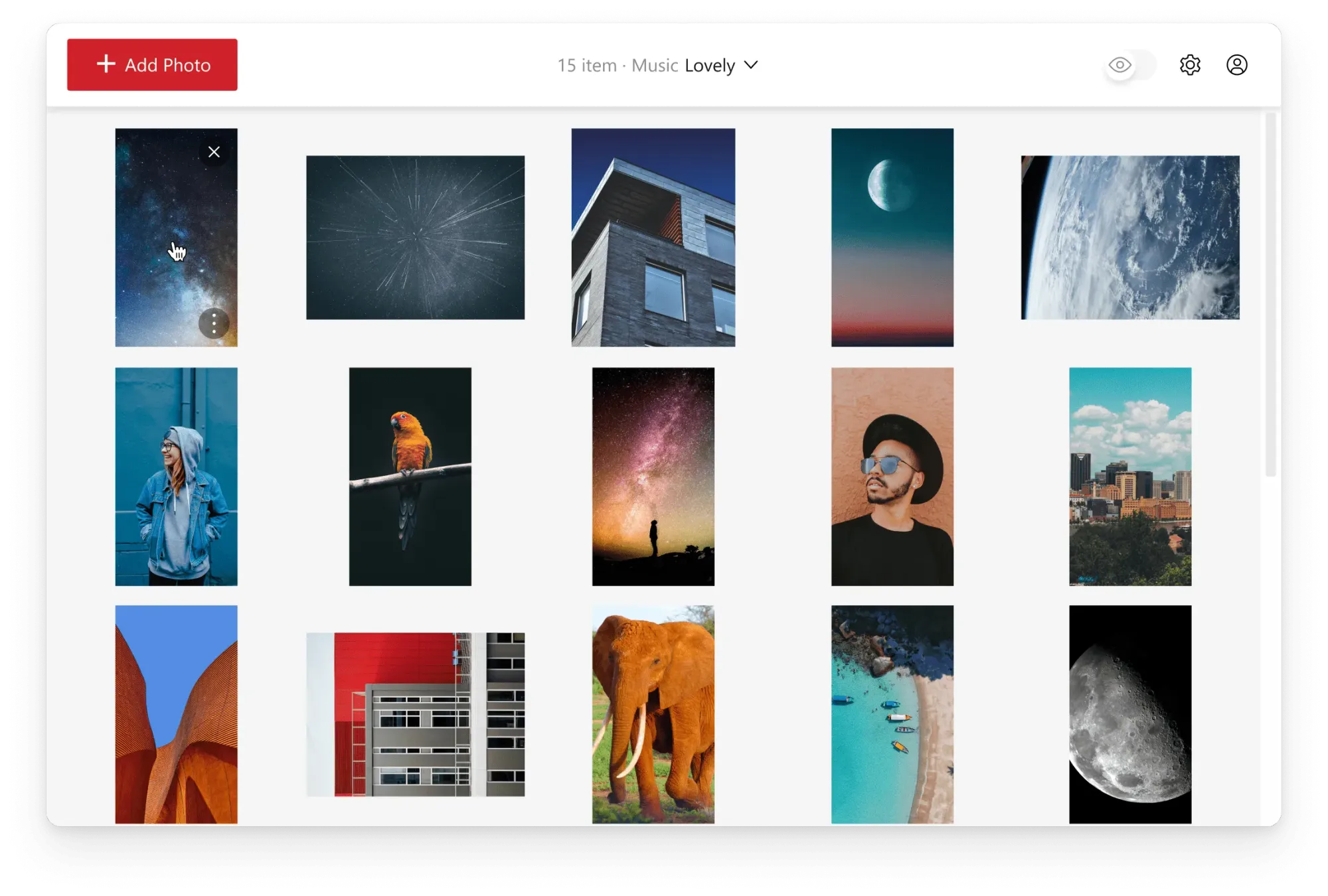 Бесплатный сервис для обработки видео и создания слайд-шоу. Просто перетащите нужные фотки и создайте своё слайд-шоу. Поддерживаются все популярные форматы изображений (PNG, JPG, WEBP и SVG).