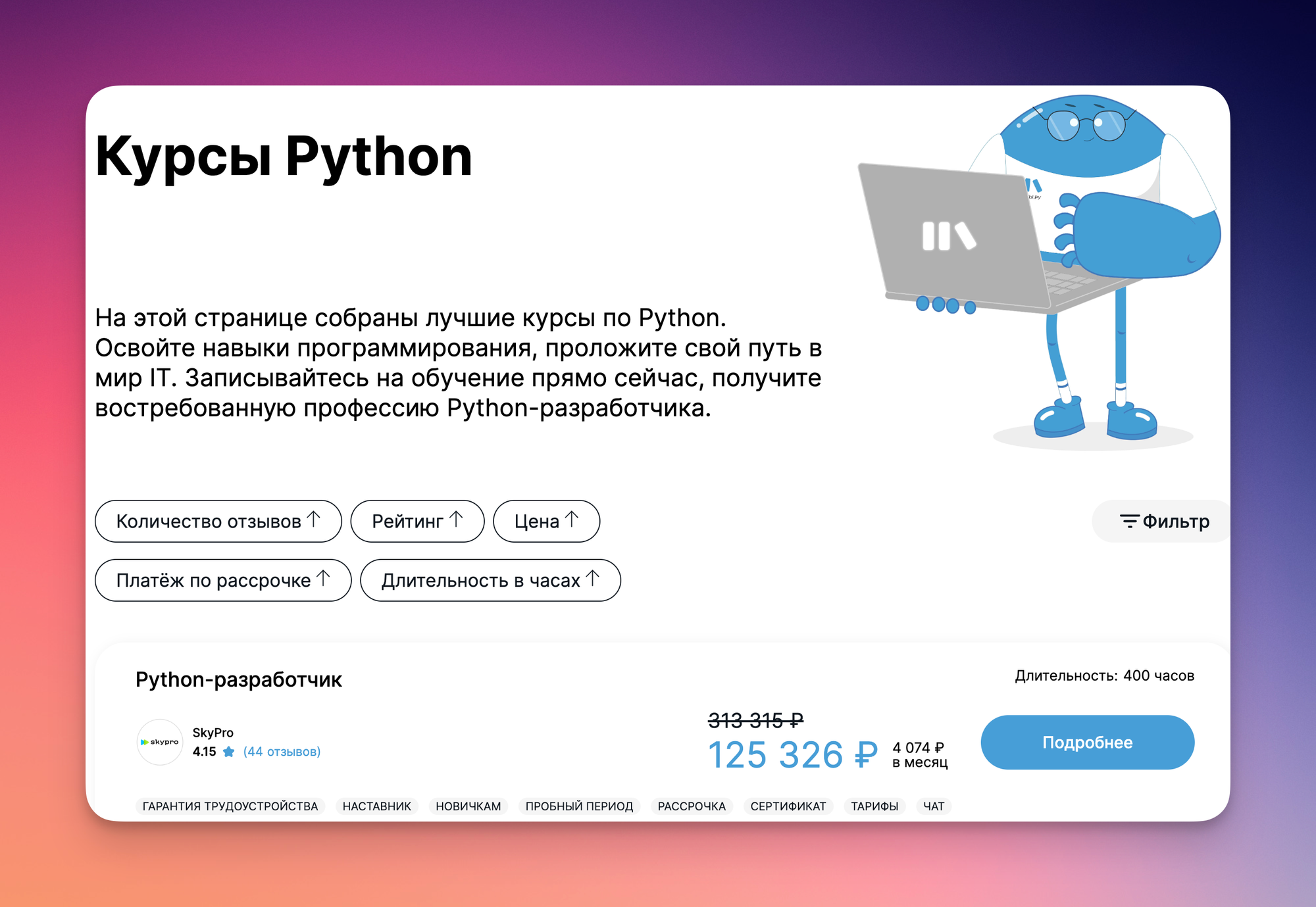 Для получения устойчивых знаний и навыков по Python требуется от 250 часов работы. Разные онлайн-школы предлагают курсы длительностью от полугода до 15 месяцев. Следует выбирать программы с учётом занятости и имеющегося времени для занятий в день и в неделю. Указанные сроки оптимальные для получения квалификации, позволяющей стать разработчиком на Python.