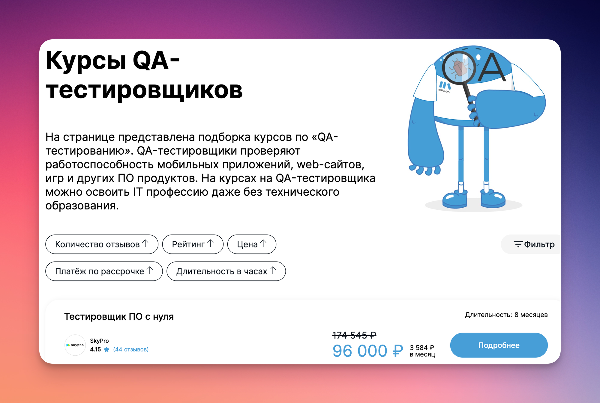 Курсы по QA-тестированию — это обучение qa с нуля до профессионального уровня за полгода. Работа QA-специалистов — проверять, как работают веб-ресурсы, мобильные приложения, игры, прикладное ПО. И для этого не нужно техническое образование.