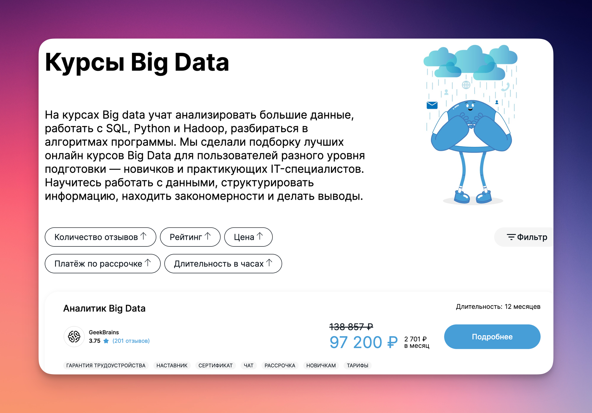 В переводе Big Data — большие данные. Предмет специальности — технологии больших баз с данными, их хранение, анализ. Для работы с базами используются специальные технические средства с программным обеспечением — распределённые системы хранения и обработки данных через сеть серверов. Они работают с данными от Петабайта и более. Петабайт — это тысяча Терабайт. Применяются во всех сферах с огромными массивами информации.