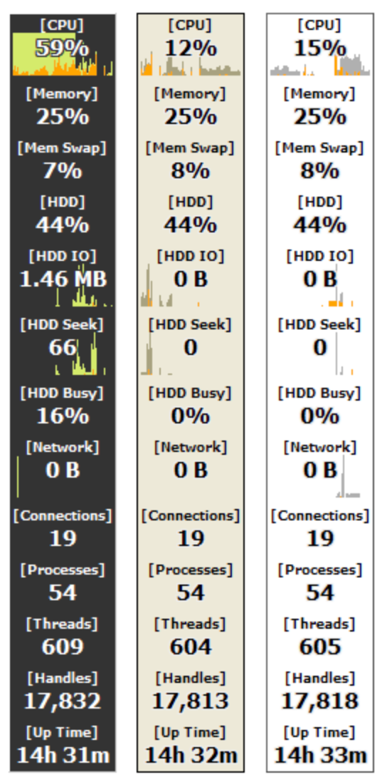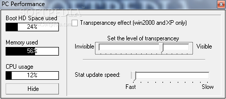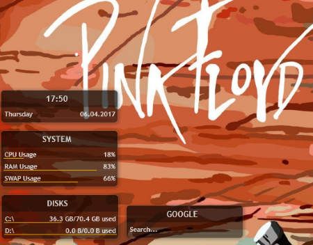 Отображает загрузку ЦП, оперативной памяти и места на жёстком диске в виде очень маленького интерфейса. Данные отображаются в режиме реального времени, при этом скорость обновления информации можно изменить. Также с помощью ползунка можно настроить степень видимости интерфейса — от полностью видимого до невидимого.