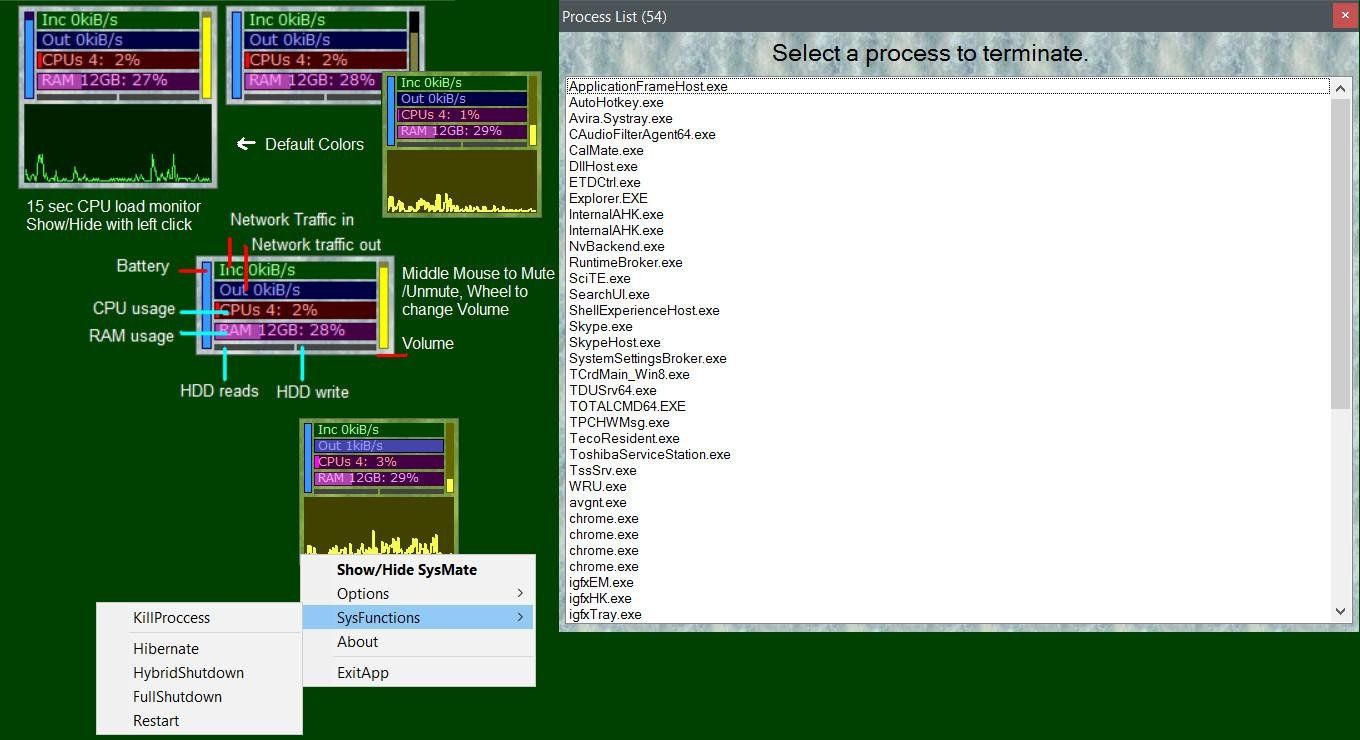 Портативная утилита для мониторинга системы, которая также отображает загрузку ЦП, оперативной памяти и сети. Эти данные программа показывает в небольшом интерфейсе вместе с графиком загрузки ЦП. Вы можете просматривать все активные процессы и отключать часть из них в случае высокой загрузки ЦП. Также при необходимости SysMate можно использовать для перезагрузки, перехода в спящий режим или выключения компьютера.