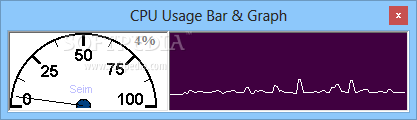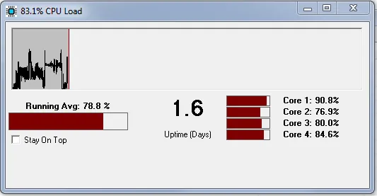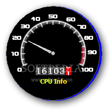 ПО для просмотра загрузки ЦП с часовым интерфейсом. На «спидометре» загрузка ЦП отображается в режиме реального времени. Стрелка двигается по шкале от 1 до 100 в зависимости от загрузки процессора. Интерфейс отображается на экране компьютера поверх всех программ или приложений. Цифровой индикатор, расположенный внизу, отображает время, прошедшее с момента запуска компьютера. Это помогает определить, увеличилась ли загрузка ПК со временем или остаётся на прежнем уровне.