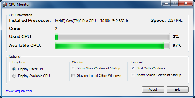 Позволяет отслеживать загрузку ЦП как из трея, так и в интерфейсе. В строке Used CPU отображается загрузка ЦП в процентах. Также здесь показана доступная загрузка ЦП в процентах. Программу можно настроить таким образом, чтобы в трее отображалась как фактическая, так и доступная загрузка ЦП в процентах.