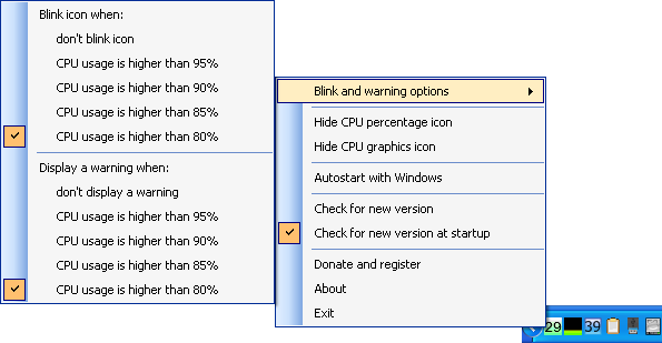 Вы можете выбрать мигание или предупреждение при превышении показателя загрузки ЦП в 80%, 85%, 90% или 95%. Все предупреждения и мигающие оповещения отображаются в системном трее. Опции мигания и отображения предупреждения можно отключить по отдельности. То есть можно активировать/деактивировать один или сразу оба типа оповещений.