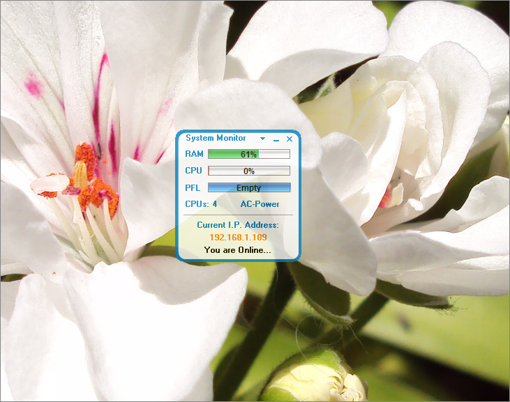 Простое ПО для мониторинга загрузки ЦП, интерфейс которого отображает очень полезную информацию. На его плавающем интерфейсе вы найдёте процент загрузки оперативной памяти, процессора и PFL (загрузка файла подкачки). Здесь также показана дополнительная информация, например количество ядер процессора, тип источника питания и текущий IP-адрес.