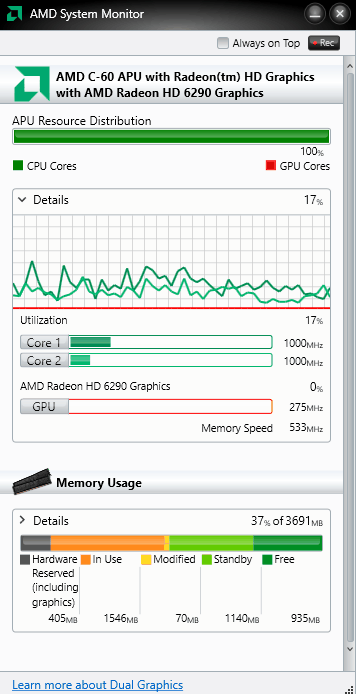 Проверял на процессоре AMD, а также на двухъядерном ЦП Intel, и он показал загрузку для обоих процессоров. Данное ПО отображает процент загрузки процессора/оперативной памяти и соответствующий график, а также загрузку каждого из ядер процессора. К сожалению, диспетчер температуры не работал ни для одного из процессоров.
