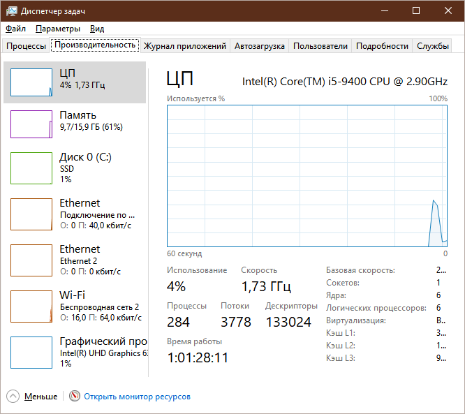 Диспетчер задач, который по умолчанию устанавливается с Windows и позволяет не только просматривать процессы и управлять ими, но и мониторить загрузку ЦП. Здесь отображается процент и график загрузки процессора. Ещё здесь показана загрузка оперативной памяти и сети, а также количество активных процессов.