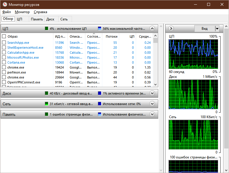 Расширенная версия предыдущего диспетчера задач. Это тоже встроенный инструмент Windows, доступ к которому можно получить прямо из диспетчера задач. Его функции практически идентичны диспетчеру задач, но здесь вы найдёте большое количество графиков. Один из графиков показывает общую загрузку ЦП, другой — загрузку ЦП службами Windows, а остальные — загрузку каждого ядра ЦП отдельно. Я протестировал это ПО на двухъядерном ПК и в результате получил 4 графика.