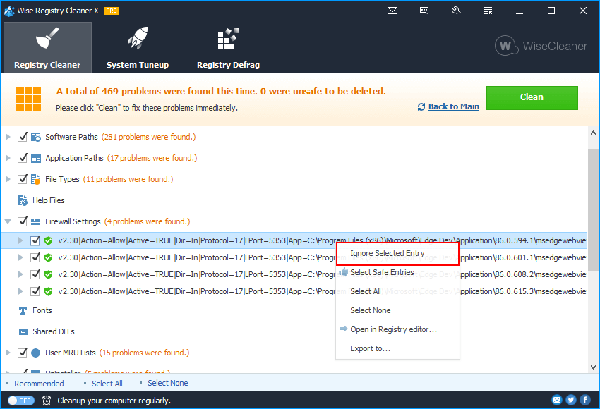 После сканирования вы увидите ряд ошибок, которые можно исправить все сразу одним щелчком мышки или же выборочно. Также можно добавить запись в список исключений, чтобы программа её игнорировала при будущих сканированиях.