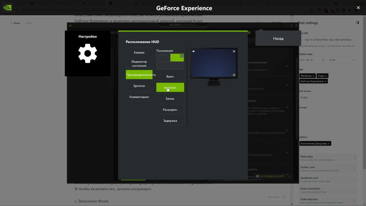 Если у вас стоит видеокарта Nvidia, вы можете установить приложение GeForce Experience и включить внутриигровой оверлей, который будет показывать FPS. Для этого нужно: