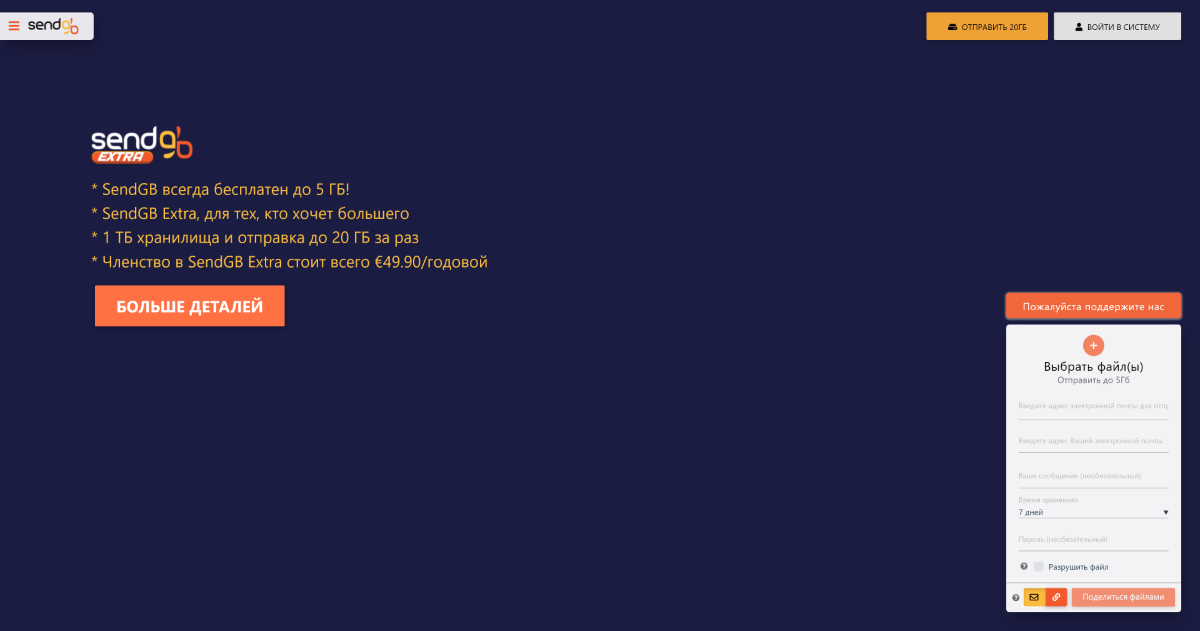 Ещё один сервис для отправки тяжёлых файлов. Здесь бесплатно можно отправить до 5 Гб, а на платном тарифе объём отправляемого файла увеличивается аж до 20 Гб.