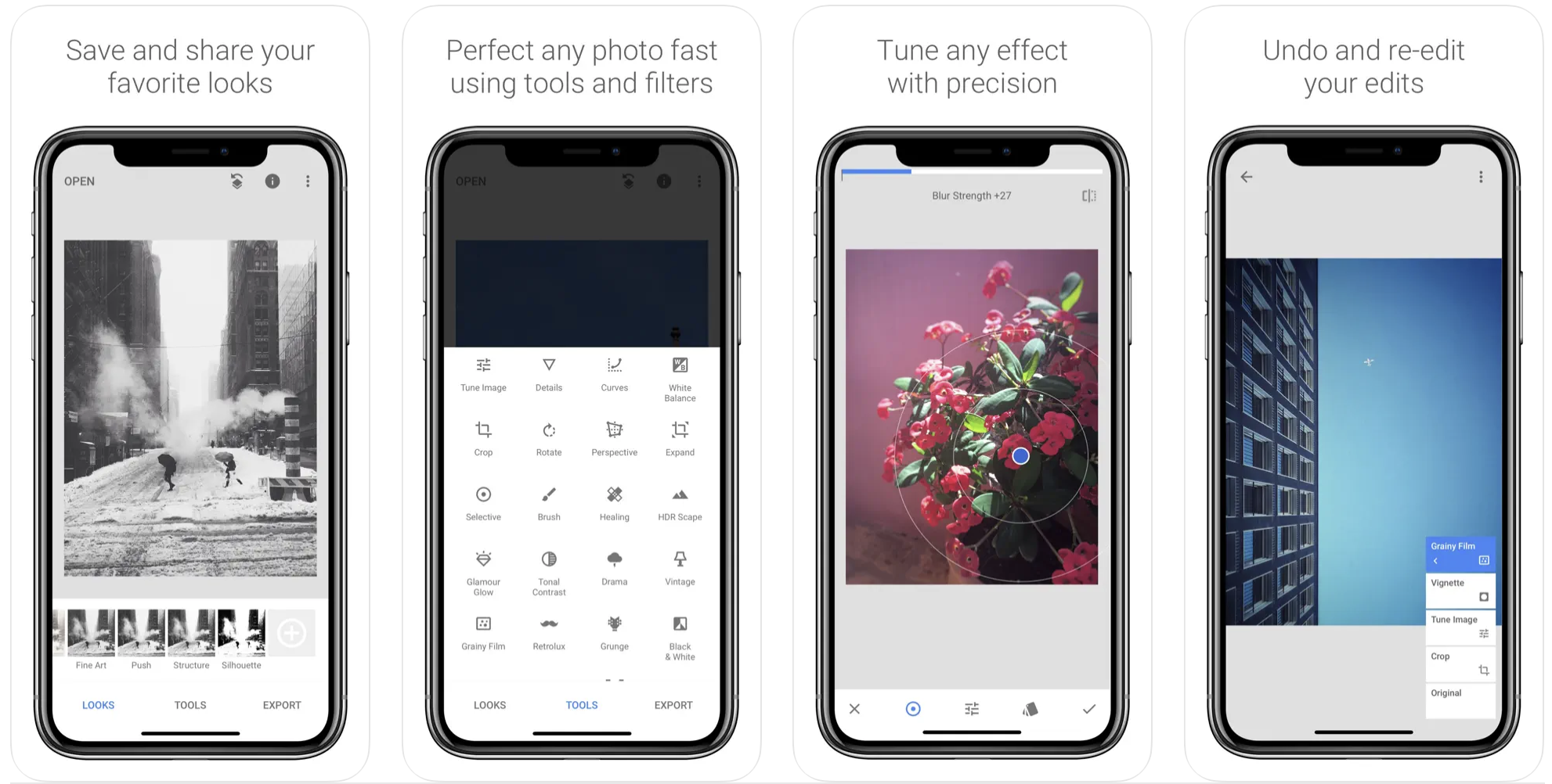 Это одно из самых первых приложений, которое хорошо справлялось с редактированием фотографий на мобилках. Здесь вы найдёте все основные инструменты, а также несколько годных фильтров и отличную систему коррекции. Она называется U Points и позволяет в несколько тапов отрегулировать яркость и цвет различных областей изображения.