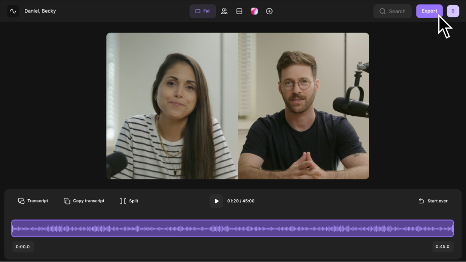 Подходит для создания подкастов, роликов для соцсетей и другого видео- и аудиоконтента. Сервис разрешает записывать, редактировать и транскрибировать аудио и видео.