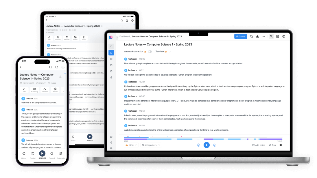 Поддерживает более 100 языков и обещает 99% точность при расшифровке. Кроме этого, сервис позволяет записывать и редактировать контент. Он даже распознаёт нескольких говорящих, выделяя это в переведённом тексте.