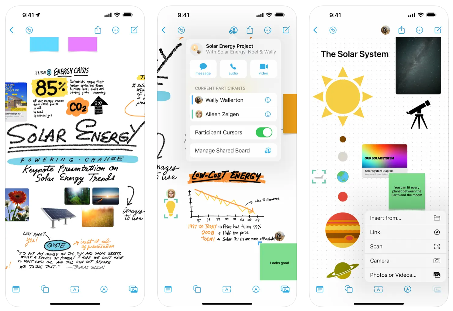 Вайтборд, который заточен под учителей и студентов. На нём вы сможете разместить практически всё что угодно: видео, изображения, презентации PowerPoint, PDF-файлы, документы Apple Pages. Также можно рисовать и делать записи от руки.