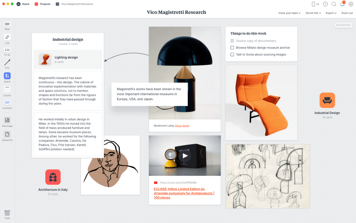 Подходит для создания мудбордов, досок для стратегического планирования и воркфлоу для людей, занимающихся графическим дизайном, дизайном интерьера и UX-дизайном.