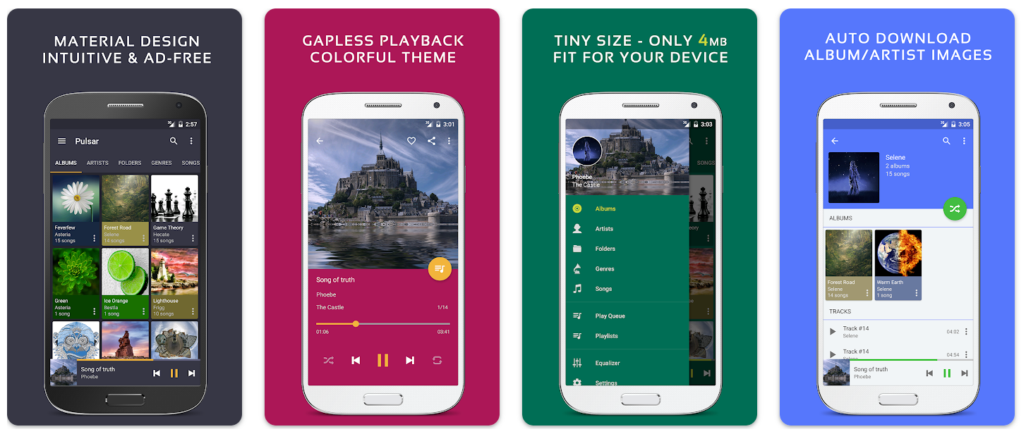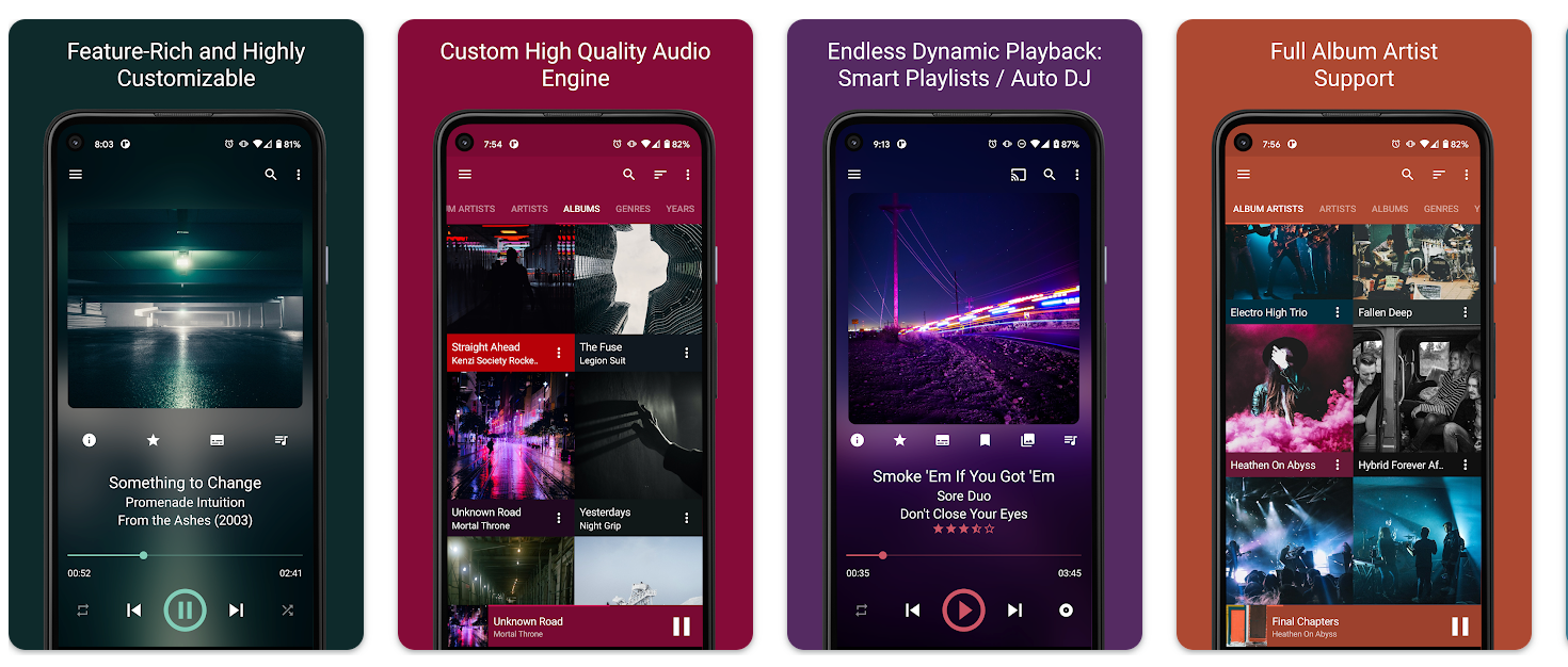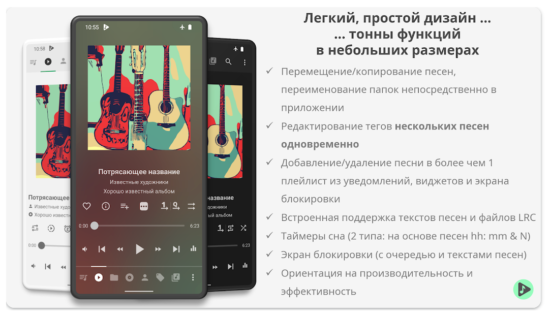 Довольно обычное приложение для прослушивания музыки, которое предлагает простой интерфейс и удобную навигацию. Также в нём есть эквалайзер, нормализатор громкости, воспроизведение без пауз, управление скоростью воспроизведения, виджет для домашнего экрана, поддержка Chromecast.