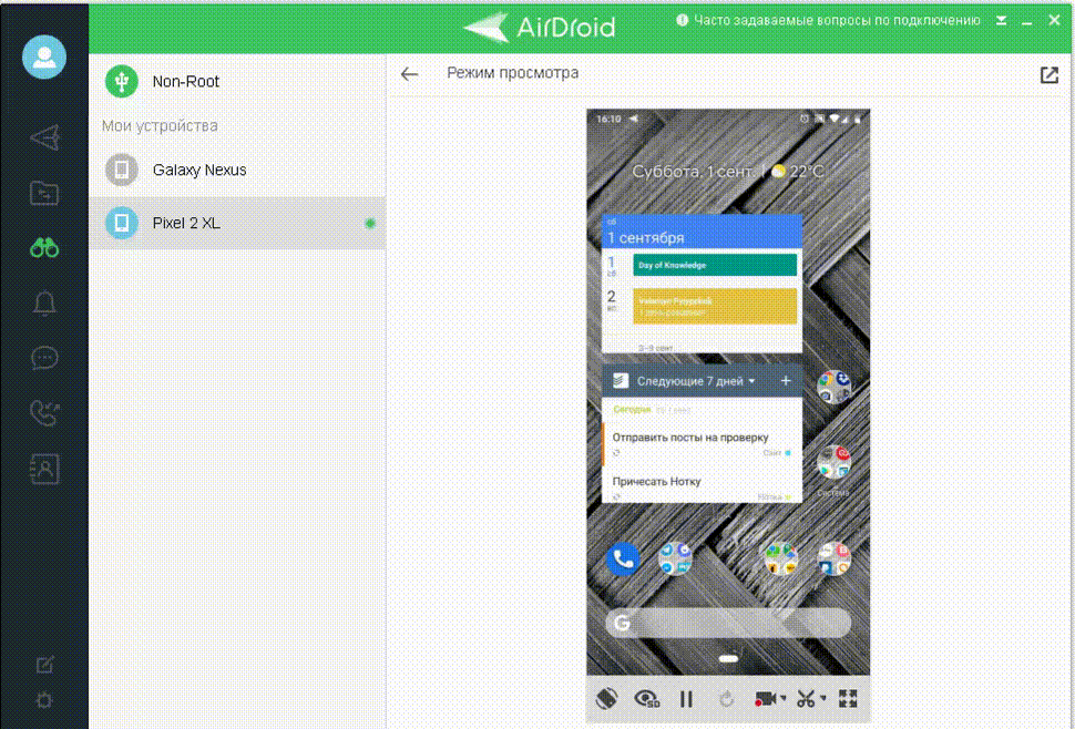 Разрешает быстро передавать файлы (работает с различными форматами), зеркалить экран, осуществлять удалённый контроль и получать уведомления на ПК. Также вы можете добавить контакты из телефона в клиент AirDroid, чтобы звонить и отвечать на СМСки с ПК.