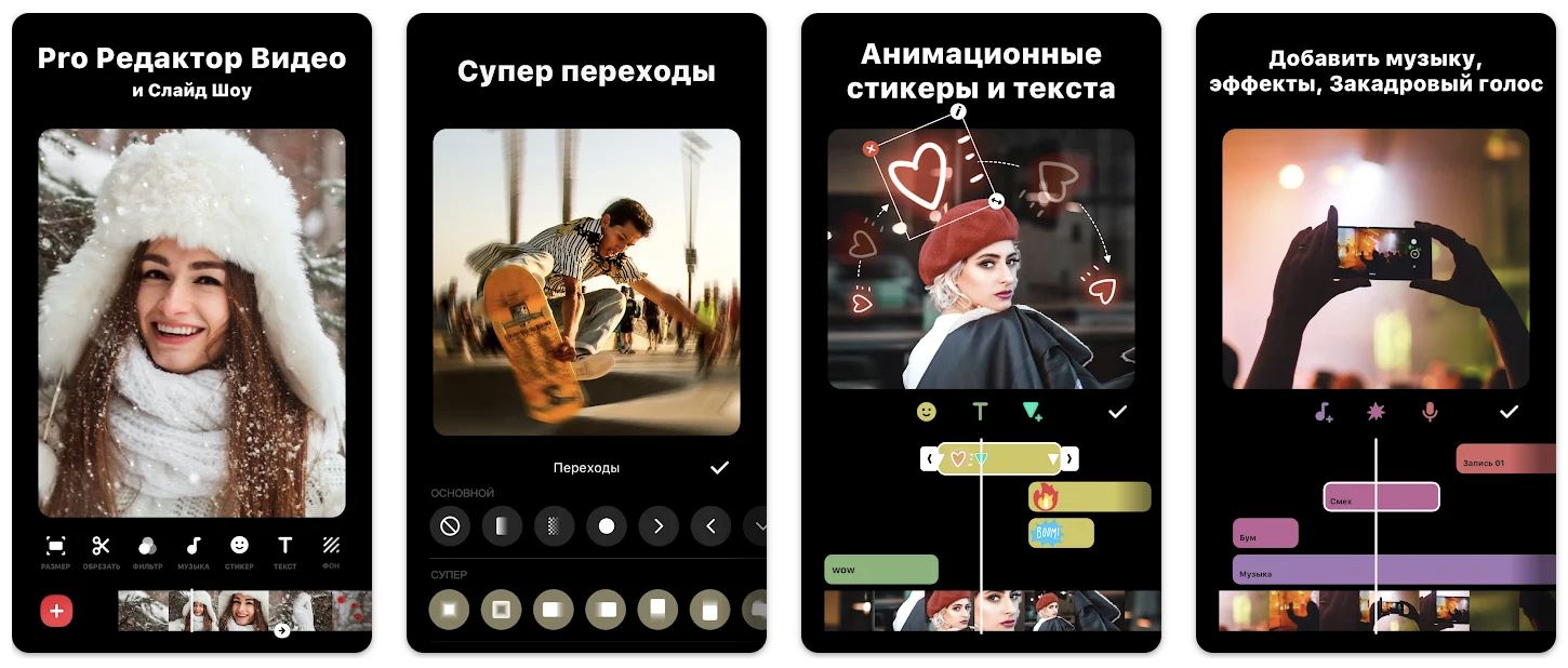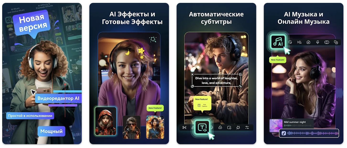 ИИ-видеоредактор с интуитивно понятным интерфейсом и большим выбором шаблонов. Также вы сможете буквально в один тап обрезать, объединить видео, добавить к нему музыку, стикеры, переходы и эффекты.