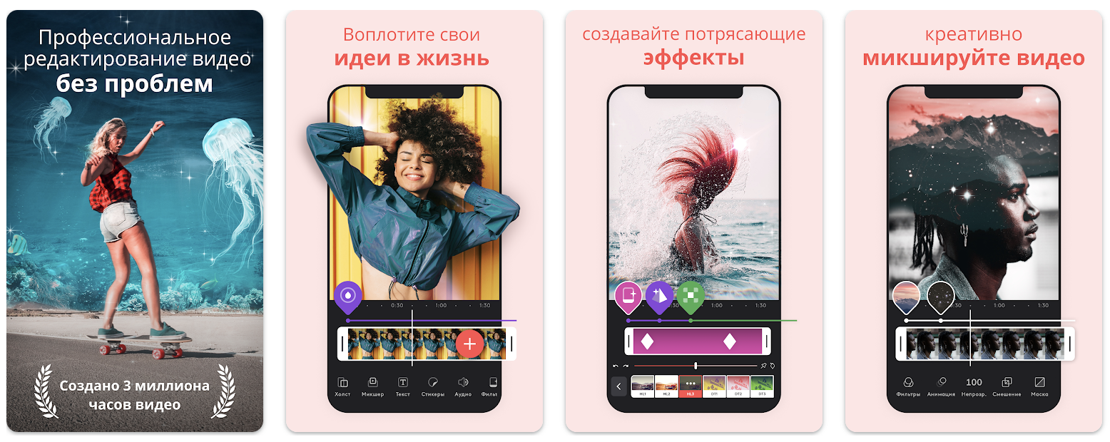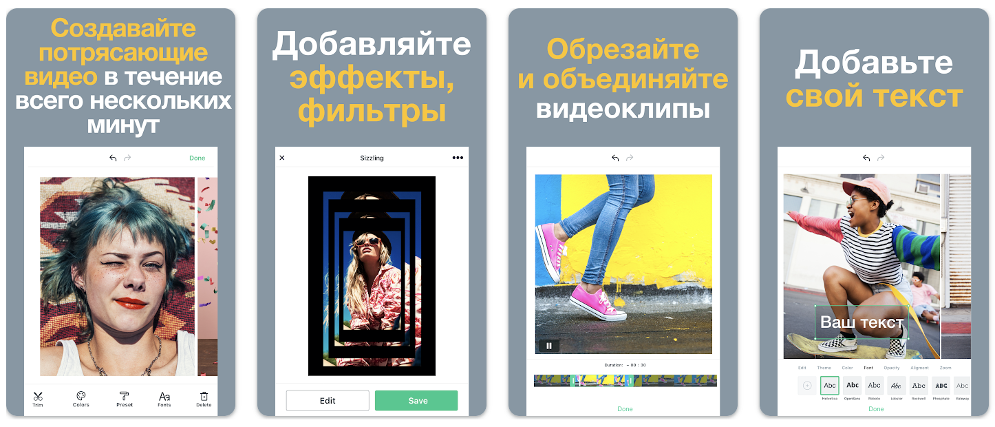 Отличная приложуха для редактирования видеороликов, которая позволяет выполнять как самые простые действия (типа обрезки, кадрирования, поворота, цветокоррекции и т.д.), так и делать более сложные штуки с видео.