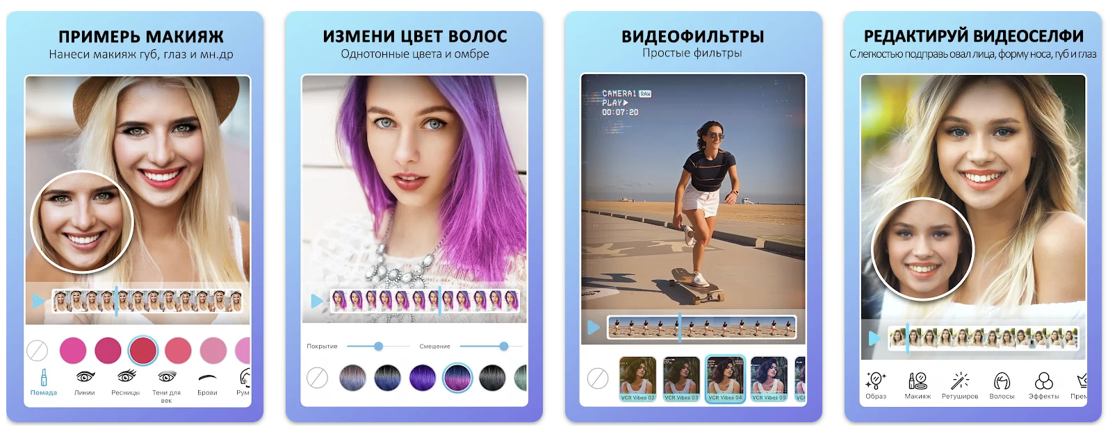 Можно добавить виртуальный макияж, изменить цвет волос и бровей, отбелить зубы, спрятать прыщи и пигментные пятна. Можно также создать мультяшный образ.