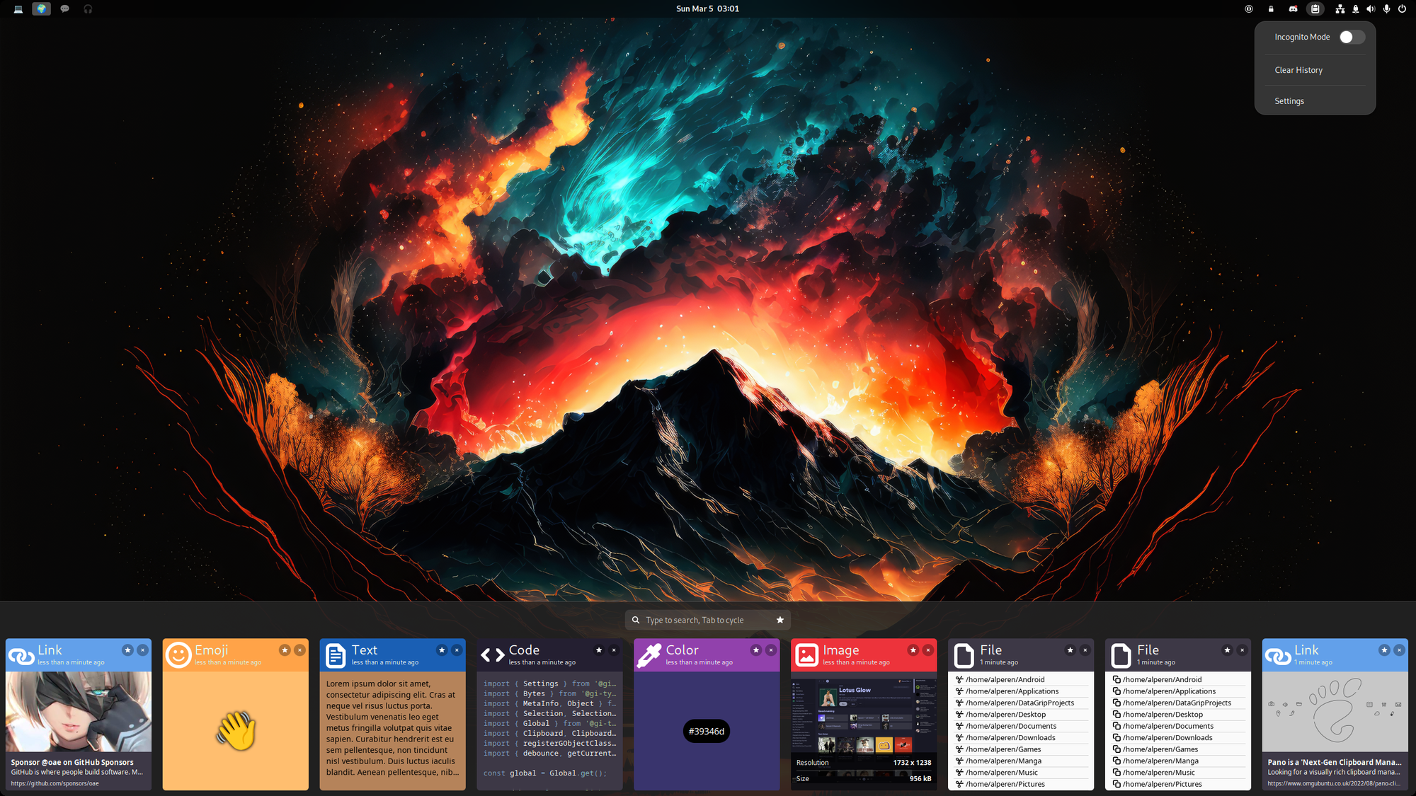 Это расширение для GNOME, которое красиво показывает превью скопированных элементов. Также вы сможете разделить эти элементы по типам (текст, картинка, файл и т.д.). Сможете настроить объём хранилища буфера обмена и исключить определённые приложения (например, менеджеры паролей).