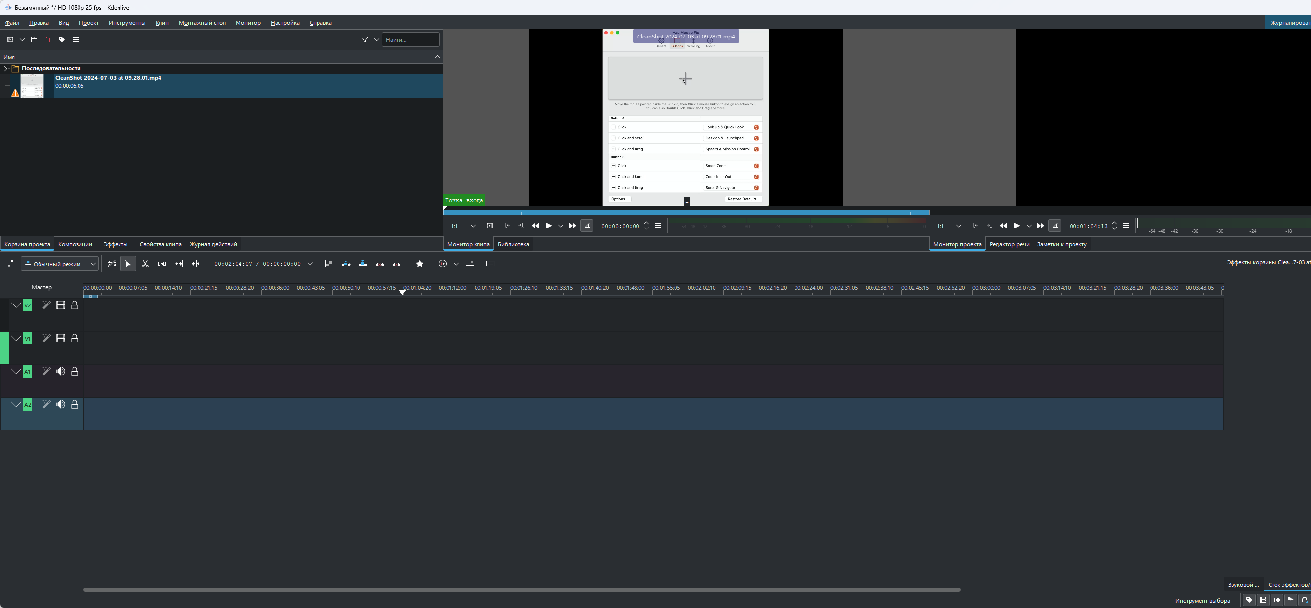 Видеоредактор с открытым кодом, который предлагает многодорожечное редактирование, поддержку различных форматов и инструменты для таких задач, как обрезка, добавление фильтров, переходов, спецэффектов и т.д. Редактирование происходит на привычном таймлайне.