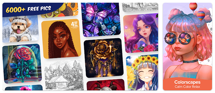 В этом приложении-раскраске более 6000 бесплатных картинок (и каждый день коллекция пополняется новыми). Есть раздел Editors’ Choice, где собраны самые популярные работы.