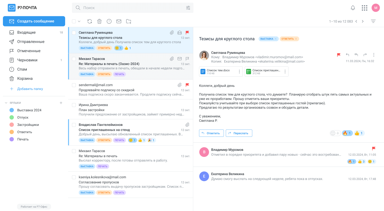 Корпоративная почта от Р7-Офис — это централизованное решение для хранения и обработки электронной корреспонденции бизнеса и госорганизаций. Поддерживает подключение нескольких доменов и учётных записей, упрощая работу с почтой.