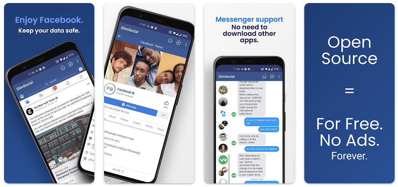 Одно из новых приложений Facebook. В нём вы найдёте довольно приличный набор функций: возможность менять тему и настраивать ленту новостей, поддержка Facebook Messenger и многое другое. Также вы сможете загружать видео с Фейсбук. Настройка ленты новостей позволяет фильтровать контент по ключевым словам. Это отличный способ избавиться от ненужных постов. Его можно с уверенностью назвать одним из лучших сторонних приложений для Facebook. Pro-версия за $1.99 открывает ещё ряд функций. Для тех, кто использует Google Play Pass, приложение бесплатное. Также поддерживаются LinkedIn, Twitter и Instagram — на случай если вы ищете альтернативы для этих платформ.