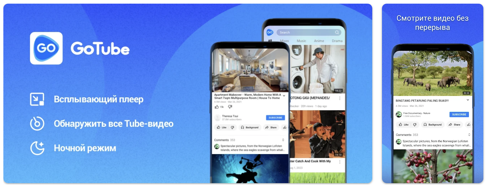 Вы можете смотреть видео в плавающем окне и одновременно работать в других мобильных приложениях. Поскольку приложение не поддерживает аккаунт Google, вы можете легко импортировать свои любимые видео и подписываться на YouTube-каналы.
