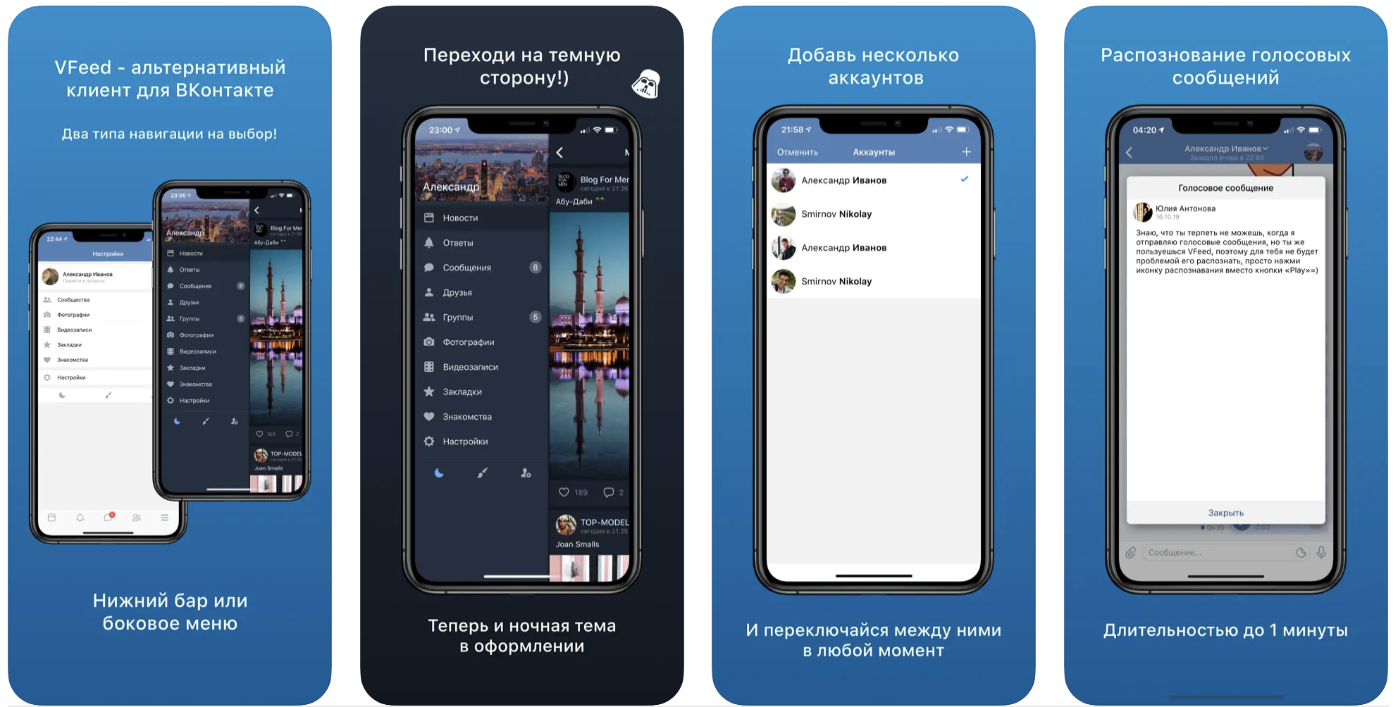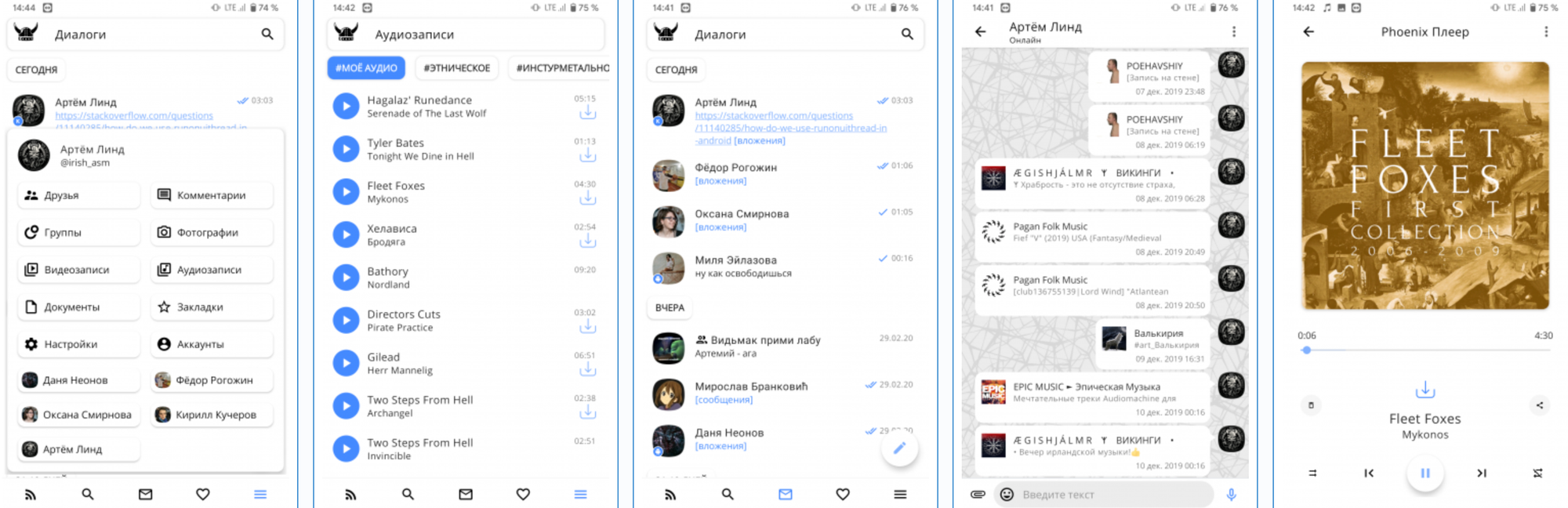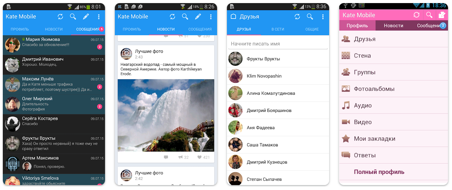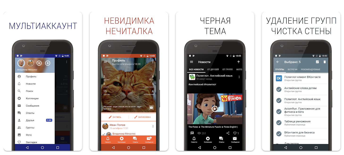 Программа отличается быстрой и стабильной работой, полностью безопасна для скачивания. Из фишек — наличие «невидимого» режима, можно использовать различные темы для интерфейса, подключать несколько аккаунтов. В программе удобно искать музыку и видеофайлы, осуществлять поиск по пользователям, просматривать различные виджеты. Есть и возможность персональных настроек по своим предпочтениям.