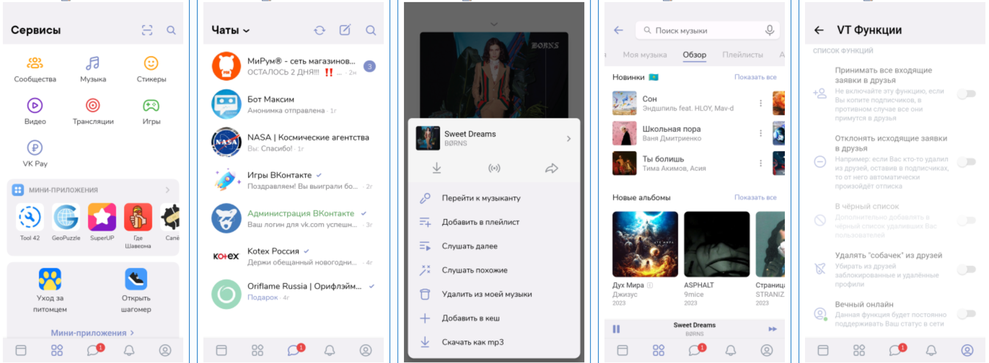 Привлекательные возможности этой версии — безлимитный доступ к музыке, тёмная тема, отключение функции слежки, есть возможность отправлять смс с помощью клавиатуры, индивидуальные настройки, скачивание музыки и видеофайлов на смартфон, использование бесплатных стикеров и доступ к закрытой информации о пользователях (например, дата создания профиля).