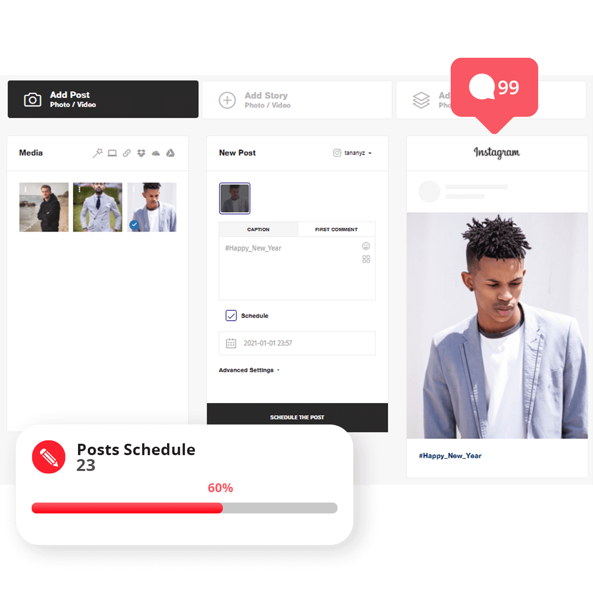 Подходит для автоматизации Instagram, Pinterest и Facebook. Есть возможность прям здесь изменить дизайн постов. Есть удобный Drag&Drop-инструмент для ручного планирования.