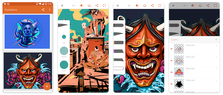Подойдёт и детям, и взрослым. Здесь вы найдёте кучу кистей (более 80 шт.), есть режим кляксы и режим заливки, поддержка слоёв и возможность смешивать их.