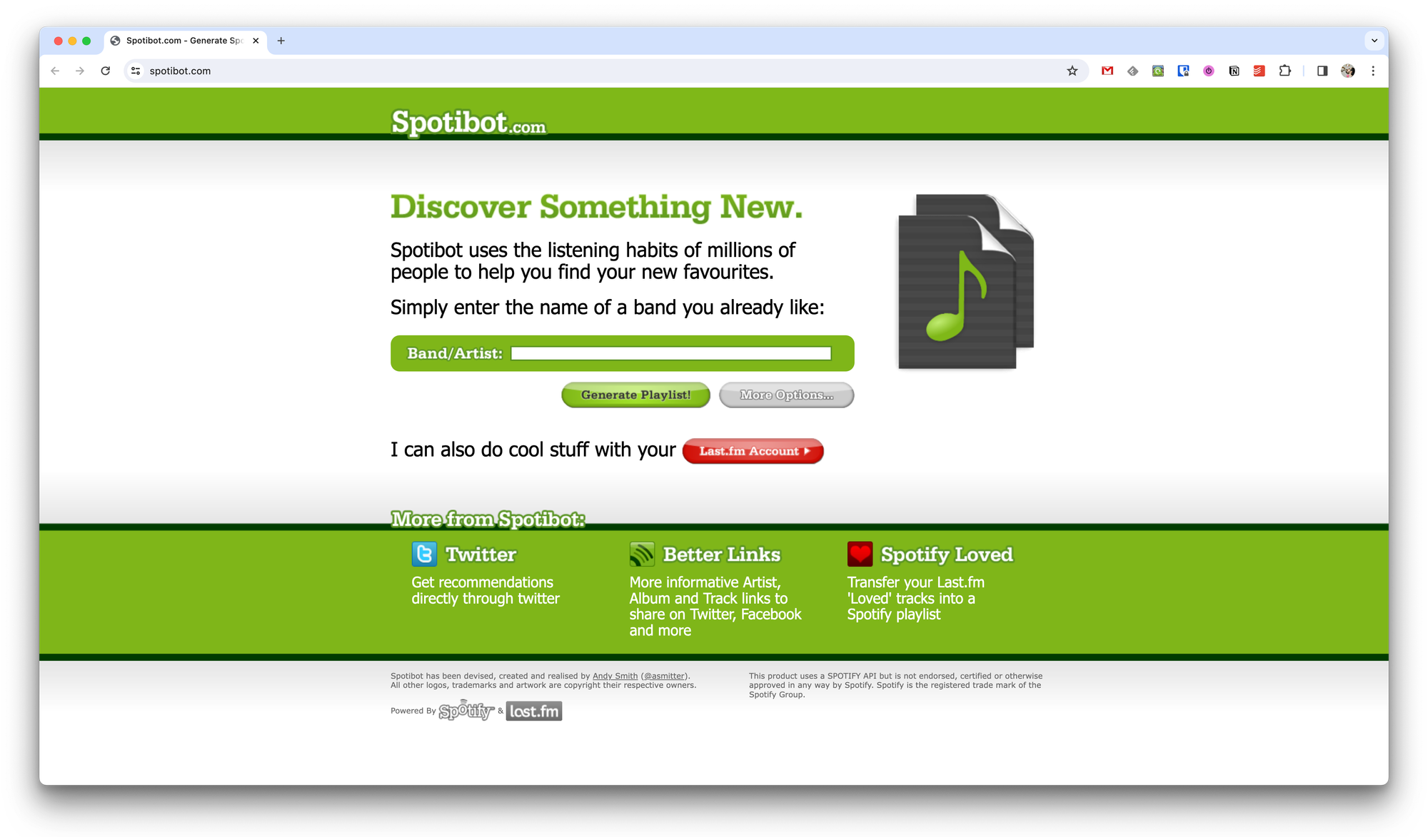 Этот сервис позволяет генерировать плейлисты на основе исполнителя либо ссылки для Spotify или Last.fm. В принципе ничего суперского тут нет, просто топ треков на основе предпочтений всех пользователей Spotify.