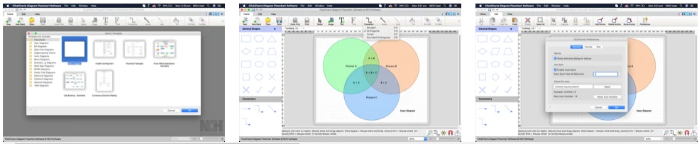 Интерфейс ClickCharts схож с программами от Office — есть менюшка и лента с кнопочками вверху. Слева расположена панель с инструментами, которую можно разворачивать и сворачивать. В ней легко можно найти нужные формы, цвета и символы, а также быстро распечатать свою диаграмму или сохранить её в PDF-, PSD- или Image-формате.