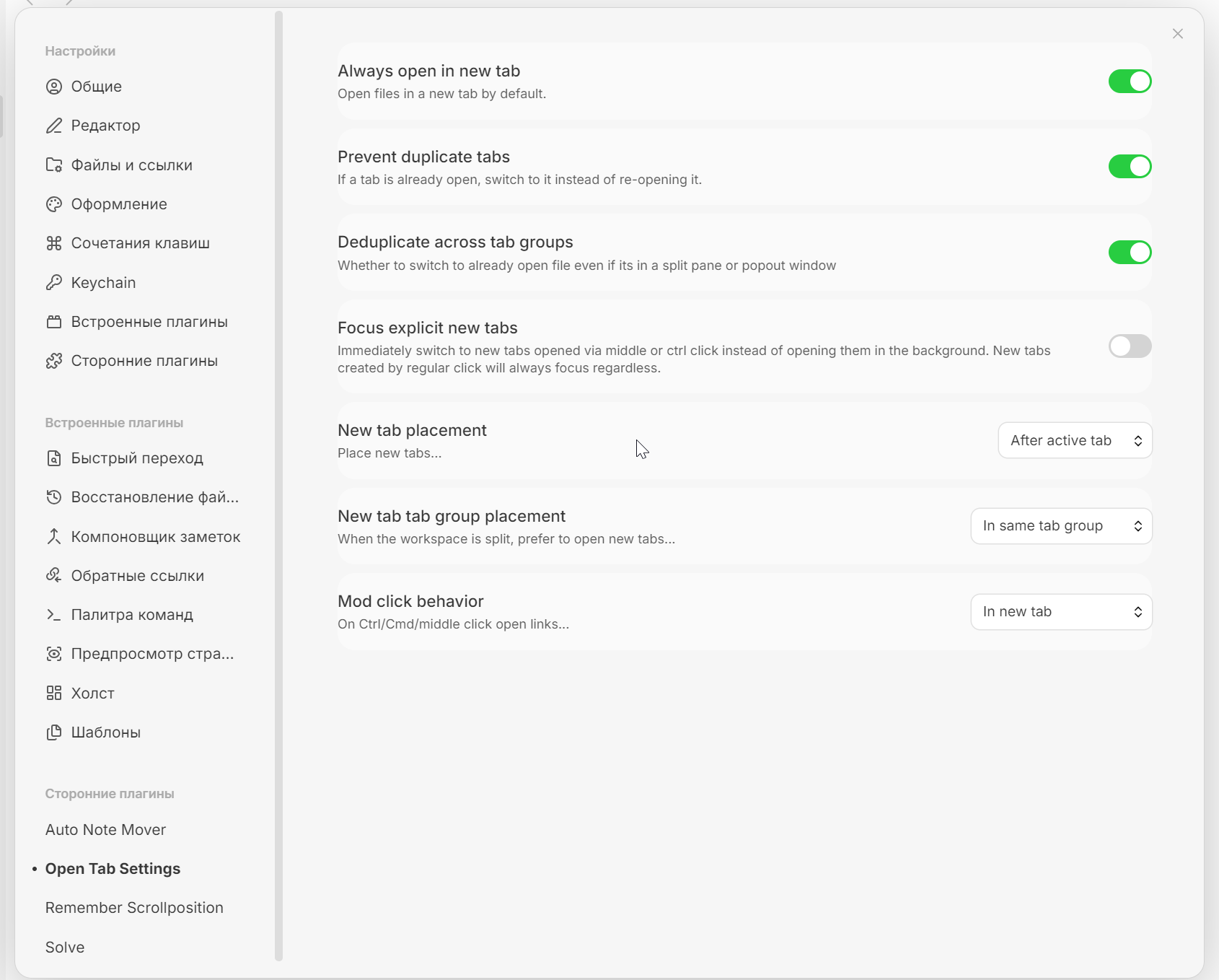 Если вы хотите сами контролировать открытие новых вкладок, то с помощью этого плагина в Obsidian появятся новые настройки.