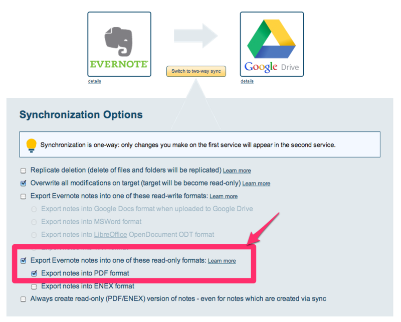 CloudHQ позволяет автоматически конвертировать заметки Evernote и отправить их в ваше облачное хранилище. Подробную инструкцию вы можете прочитать здесь.