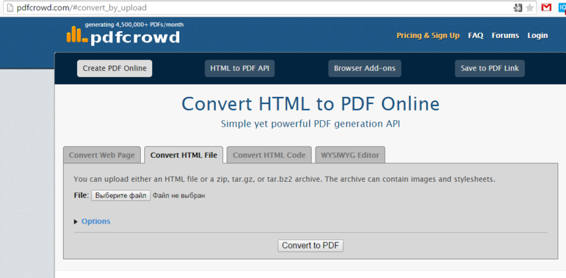 Если в вашем браузере нет такой опции, то вы можете воспользоваться сервисом pdfcrowd. pdfcrowd позволяет загрузить любой .html файл и в один клик преобразовать его в .pdf: