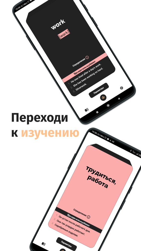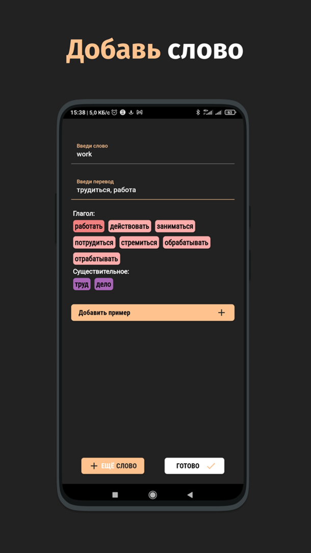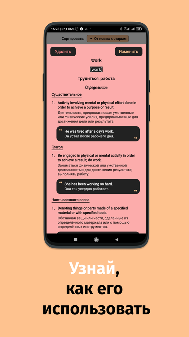 А чтобы пополнить не только словарь, но и активный словарный запас, обязательно нужно знать, как это слово используют носители языка. Нажав на слово из своего словаря, ты можешь увидеть, в каких частях речи и в каком значении его можно встретить.