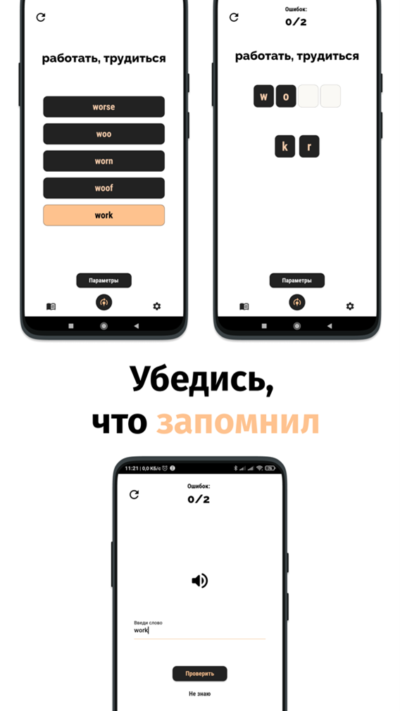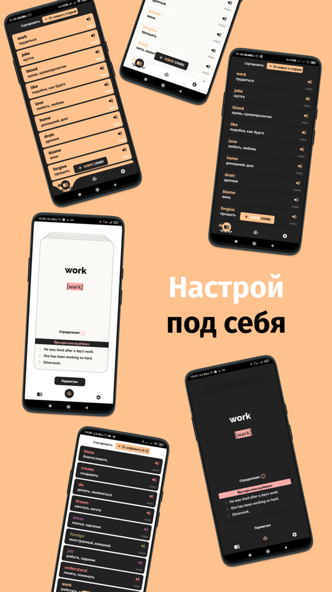 - настраиваемые упражнения для изучения и повторения (карточки слов, выбор правильного перевода, конструктор слова, аудирование);